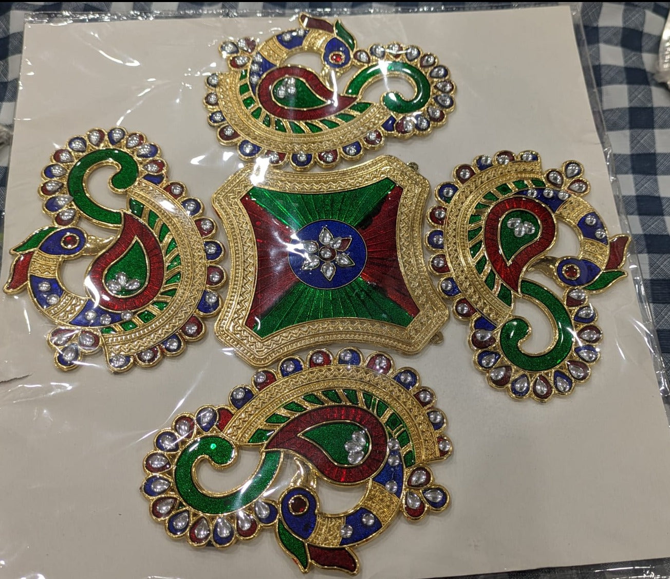 Rangoli peacock design red, green & gold color